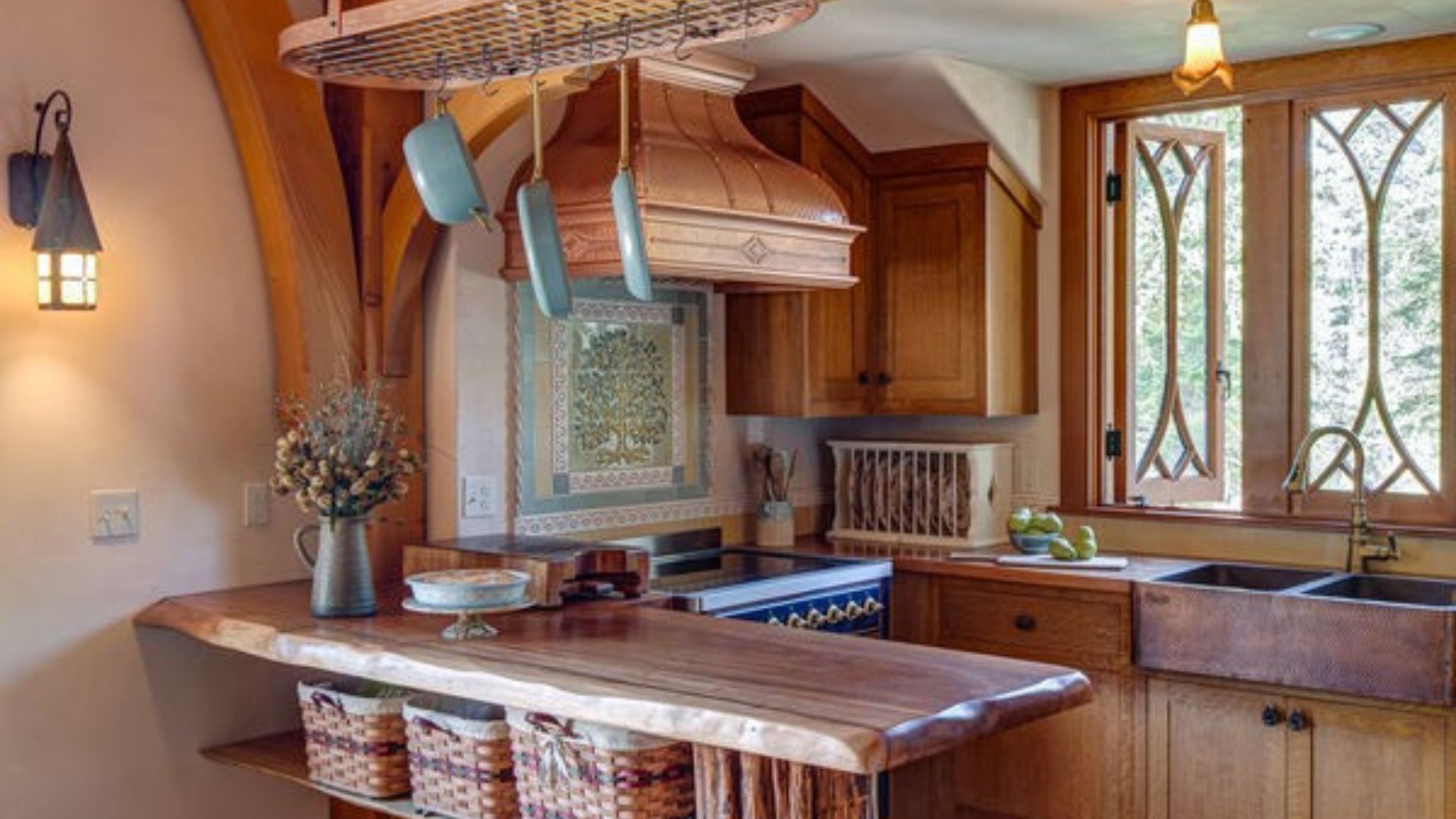 Although the kitchen looks rustic at first with wooden cabinets and countertops when you take a closer look, you’ll see modern amenities too. I love how the hood above the stove was designed in an almost ancient style.